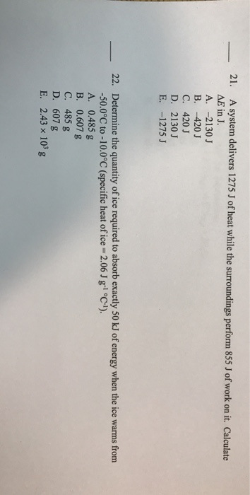 A system delivers 1275 J of heat while the surroundings perform 855 J of work on it. Calculate delta U in J. -1275 J Determine The Quantity Of Ice Required To Absorb Exactly 50 KJ Of Energy When The Ice Warms From -500C To -100C specific Heat Ofice 206 Jg1 C-. A -2130 J B -420 J C 420 J D 2130 J E -1275 J. A system delivers 1275 J of heat while the surroundings perform 855 J of work on it. A system delivers 1275 J of heat while the surroundings perform 854 J of work on it. A system delivers 1275 J of heat while the surroundings perform 855 J of work on it.
