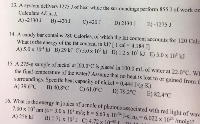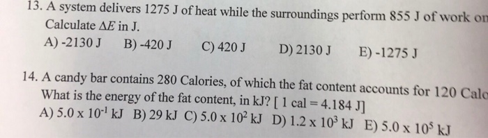 Calculate E In J. A system delivers 225 J of heat to the surroundings while delivering 645 J of work. Calculate esys in j. Calculate ΔE in J. Calculate the change in the internal energy. A system delivers 1275 J of heat while the surroundings perform 855 J of work on it. A device absorb 600 J of heat and work tantamount to 300 J on its surroundings. A -2130 J B -420 J C 420 J D 2130 J E -1275 J. A system delivers 1275 J of heat while the surroundings perform 855 J of work on it.